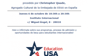 ¿Quieres estudiar en Estados Unidos? En colaboración con EducationUSA y American Space Madrid, las universidades de Columbia, Duke, Georgetown, Northwestern, Princeton and Vanderbilt celebran un encuentro con Christopher Quade, Agregado Cultural de la Embajada de EEUU en España el jueves, 6 de octubre de 18:30h a 20:30h en el Instituto Internacional. ¡Ven a infórmate sobre